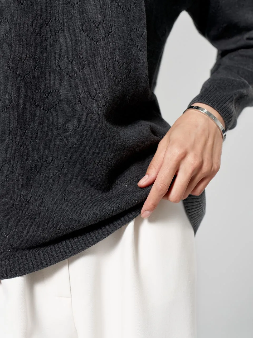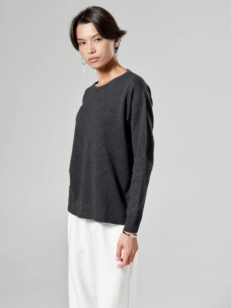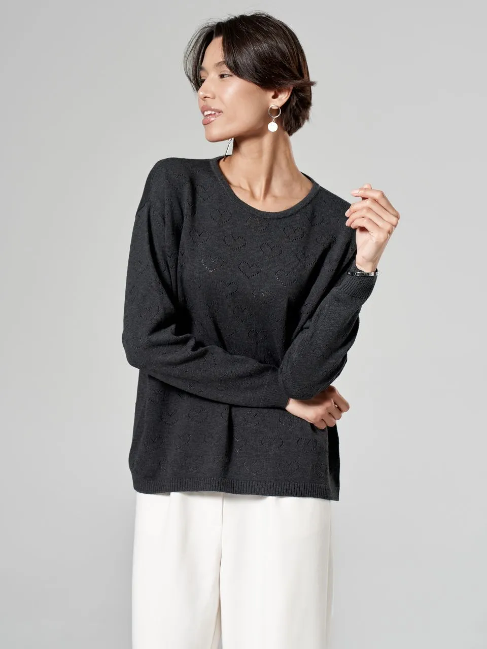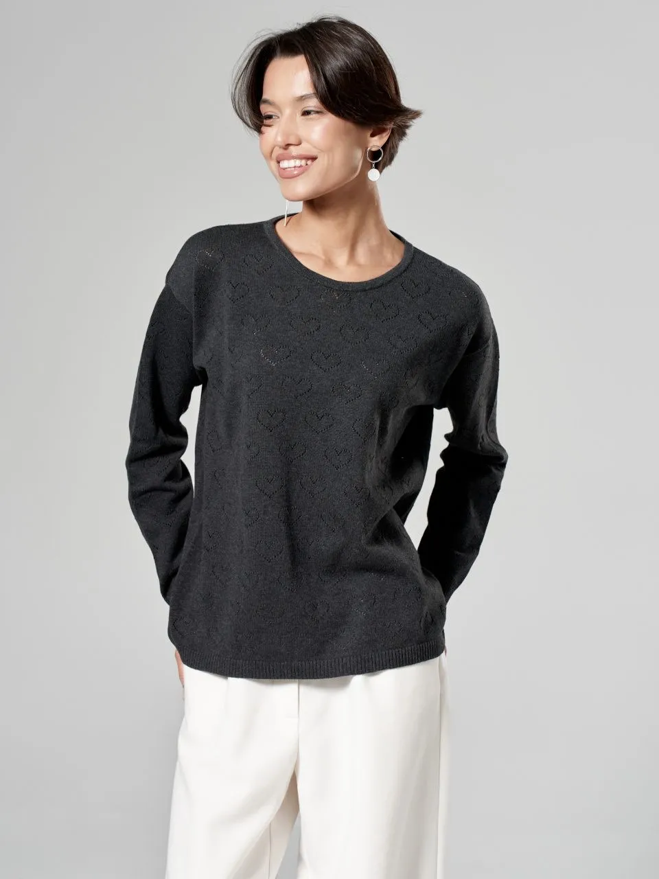 Этот джемпер - идеальное воплощение романтики и повседневного комфорта. Выполненный из натурального хлопка, он дарит коже ощущение прохлады и легкости, что делает его отличным выбором для весенне-летнего сезона. Изящный ажурный узор в виде сердец добавляет образу женственности и легкости, превращая базовую вещь в нарядный акцент.