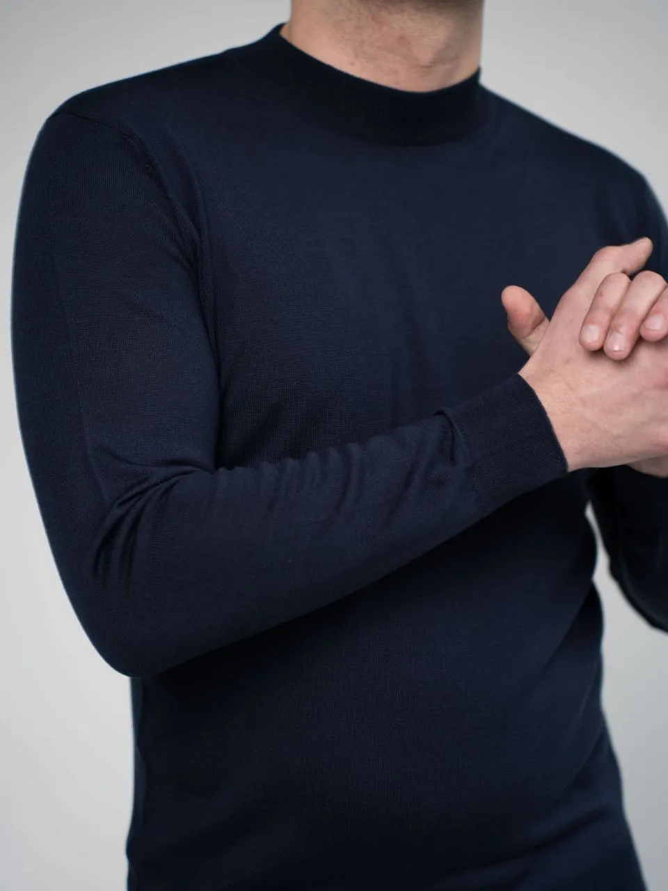 Этот джемпер из итальянской пряжи: 50% гребенной меринос, 50% акрил. Гребенная обработка шерсти делает полотно тонким и гладким, а акрил придает изделию высокую прочность и износостойкость. Джемпер очень приятен на ощупь, не теряет форму и практически не скатывается даже при активной носке. Качество значительно выше стандартных полушерстяных составов.