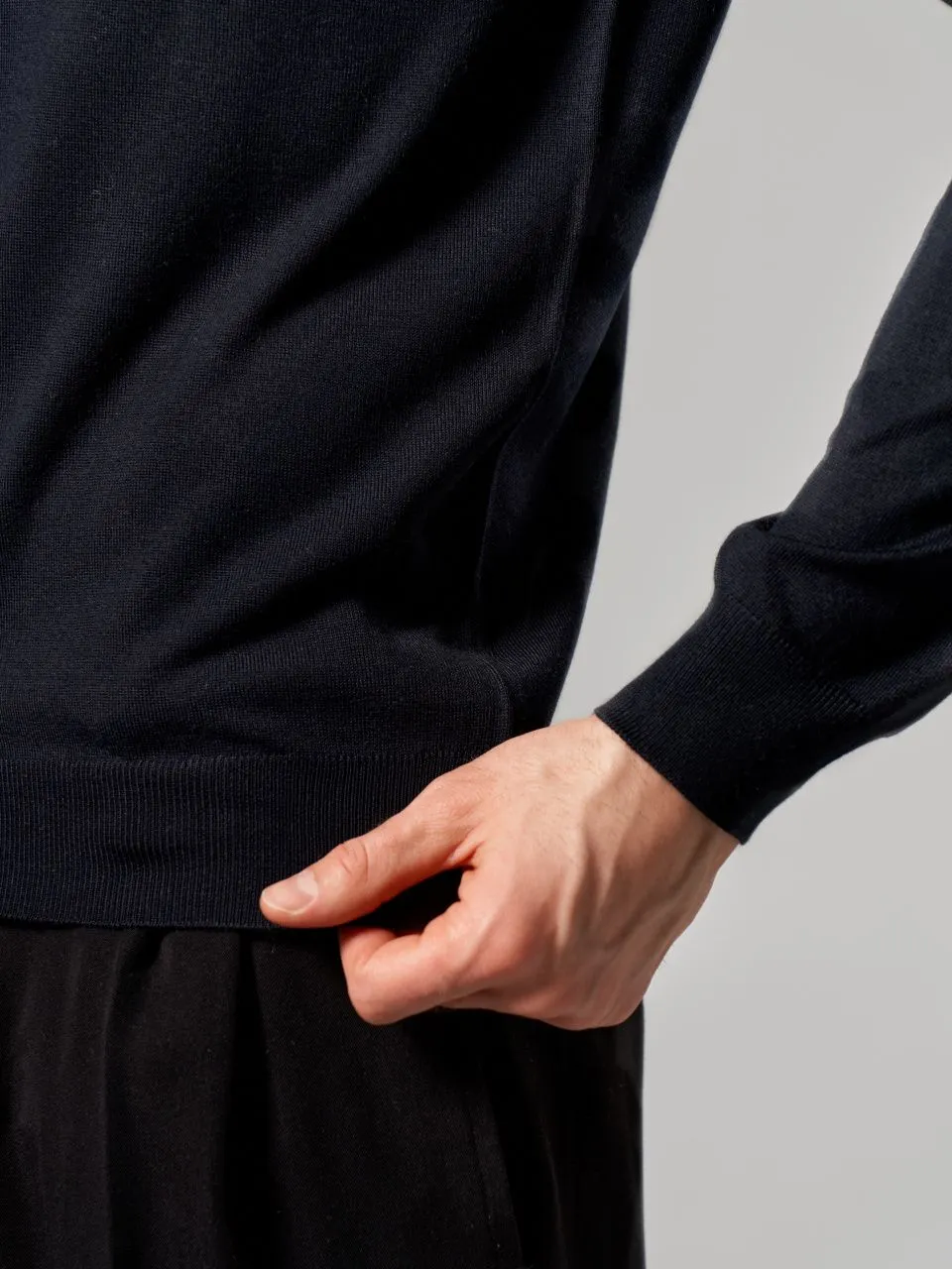Этот джемпер из итальянской пряжи: 50% гребенной меринос, 50% акрил. Гребенная обработка шерсти делает полотно тонким и гладким, а акрил придает изделию высокую прочность и износостойкость. Джемпер очень приятен на ощупь, не теряет форму и практически не скатывается даже при активной носке. Качество значительно выше стандартных полушерстяных составов.