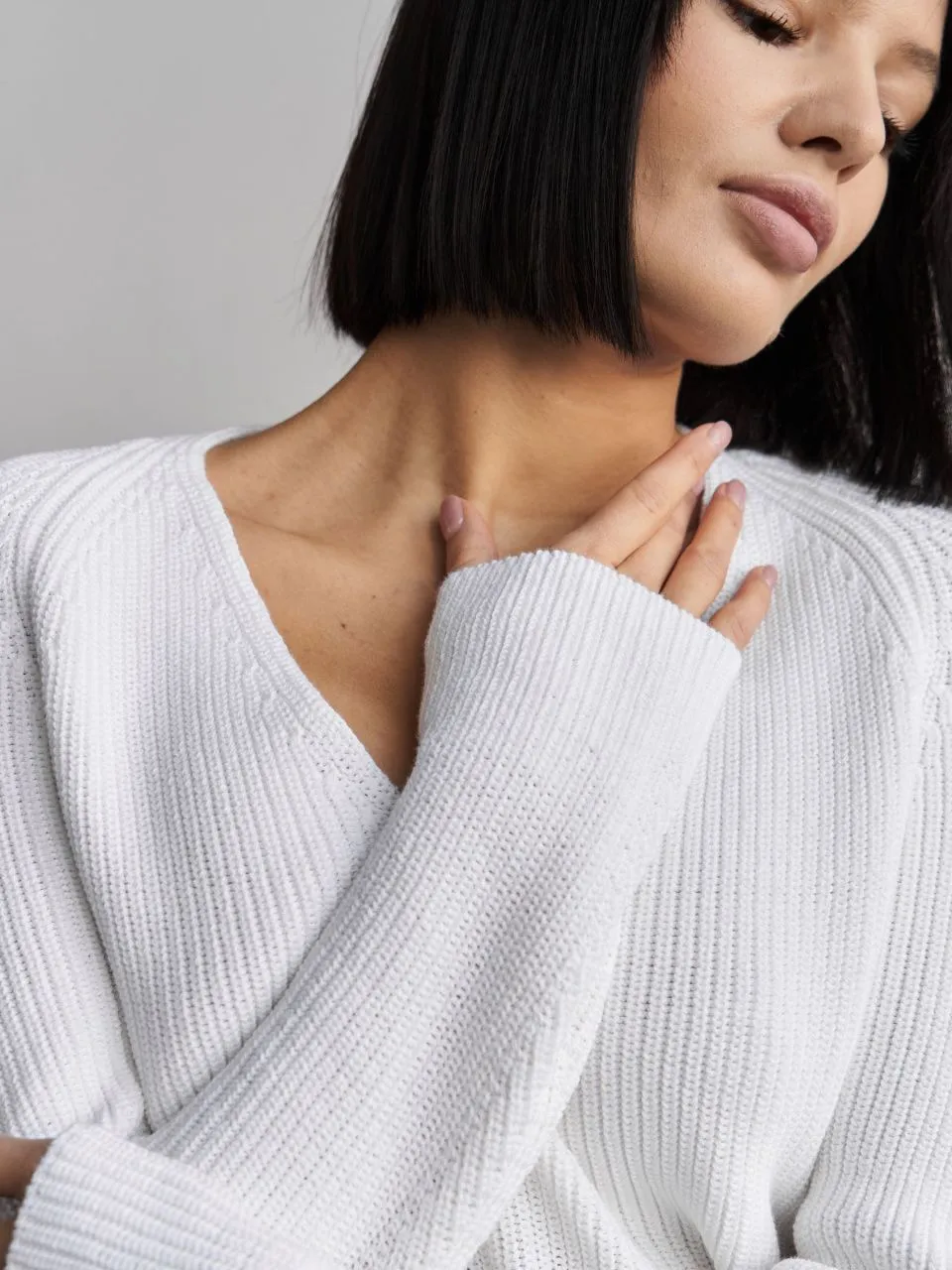 • V-образный глубокий вырез добавляет элегантности и подчеркивает линию шеи.