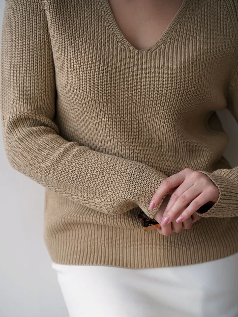 • V-образный глубокий вырез добавляет элегантности и подчеркивает линию шеи.