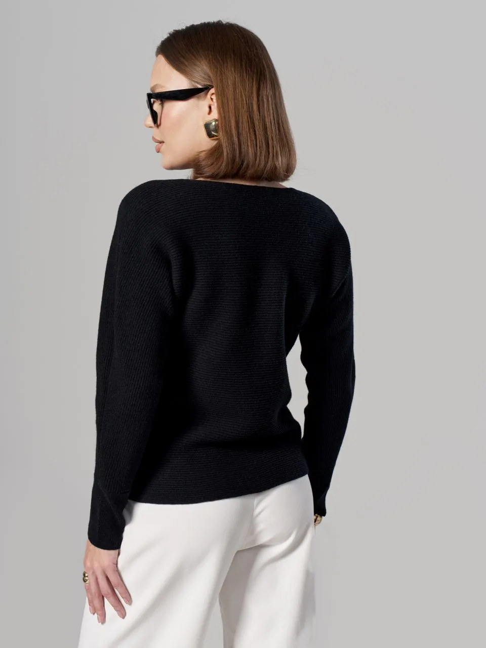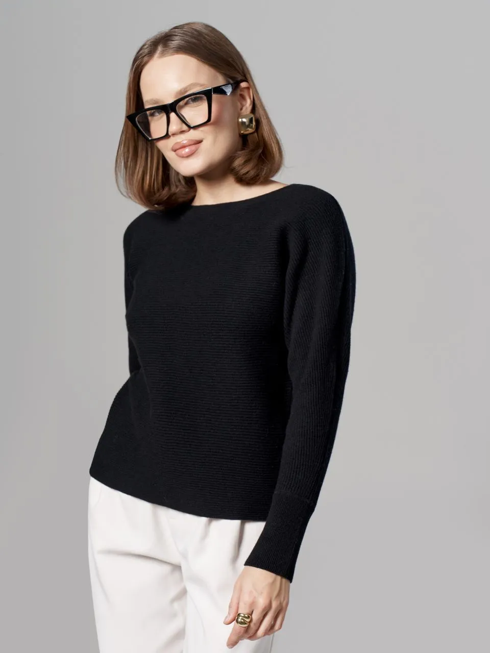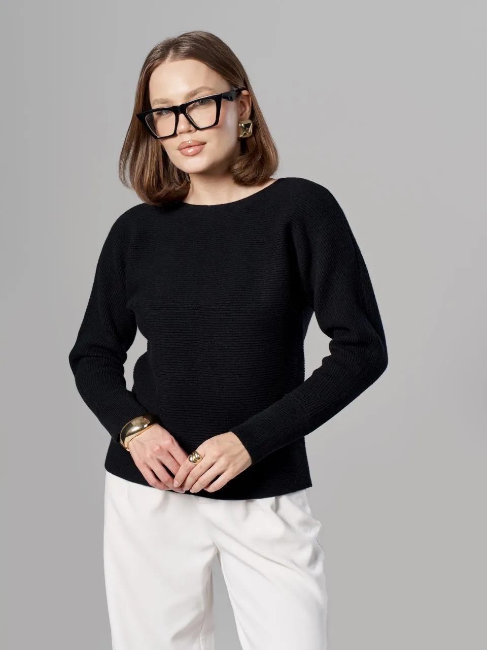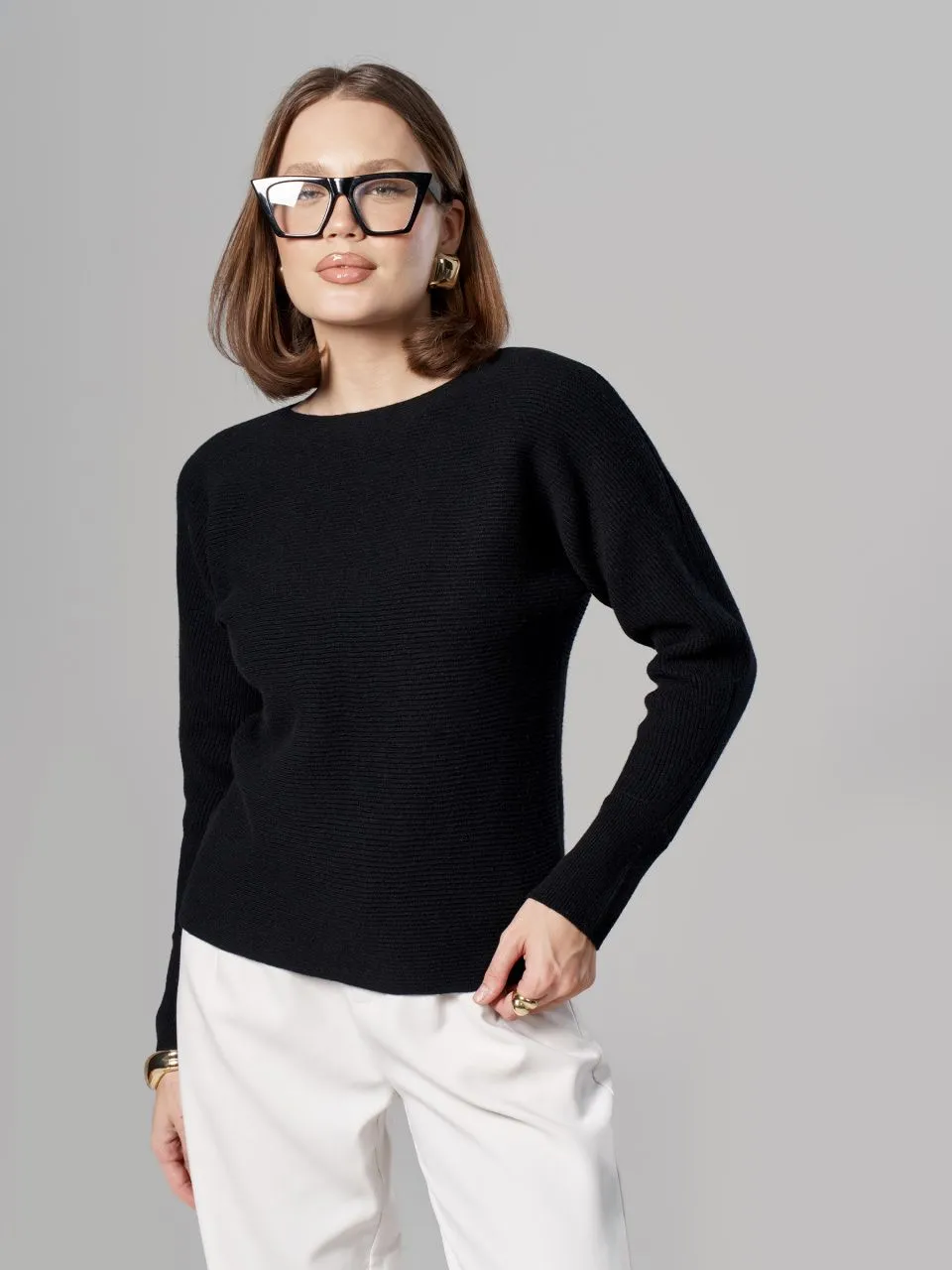 Джемпер в горизонтальный рубчик из шерсти мериноса кардного качества.