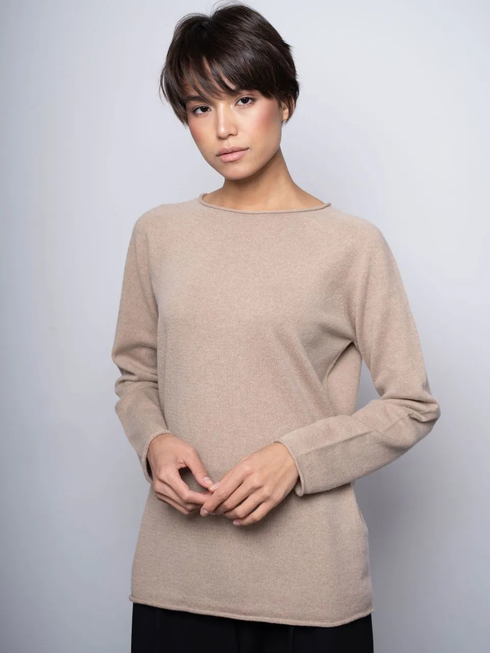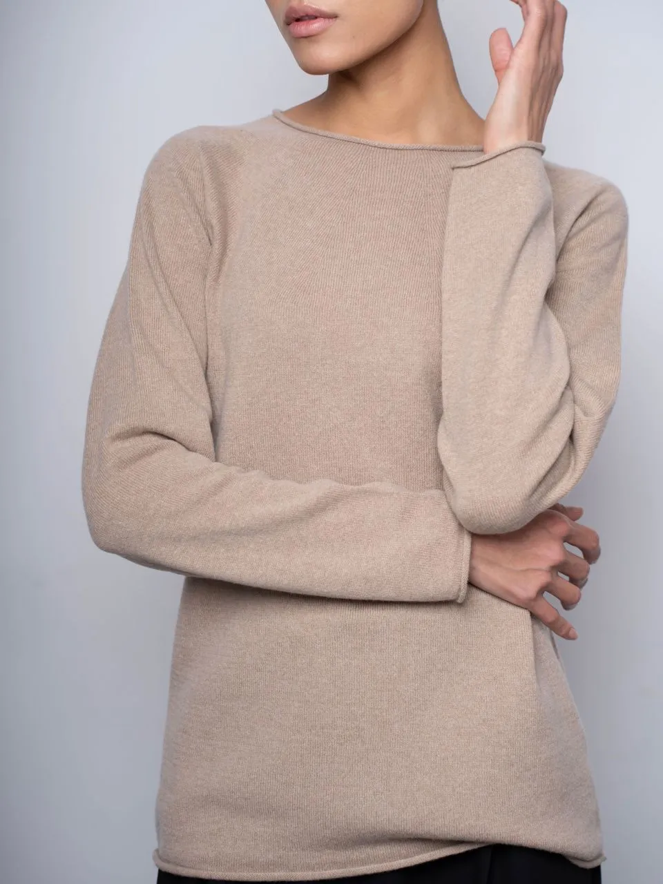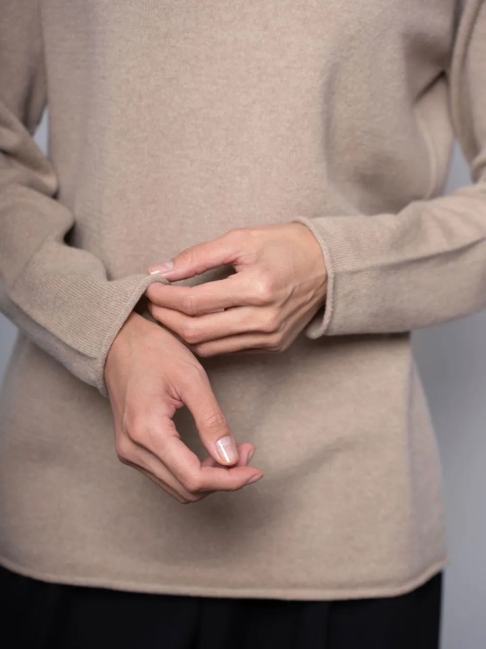 •  Манжеты и низ джемпера с закручивающимся краем.
