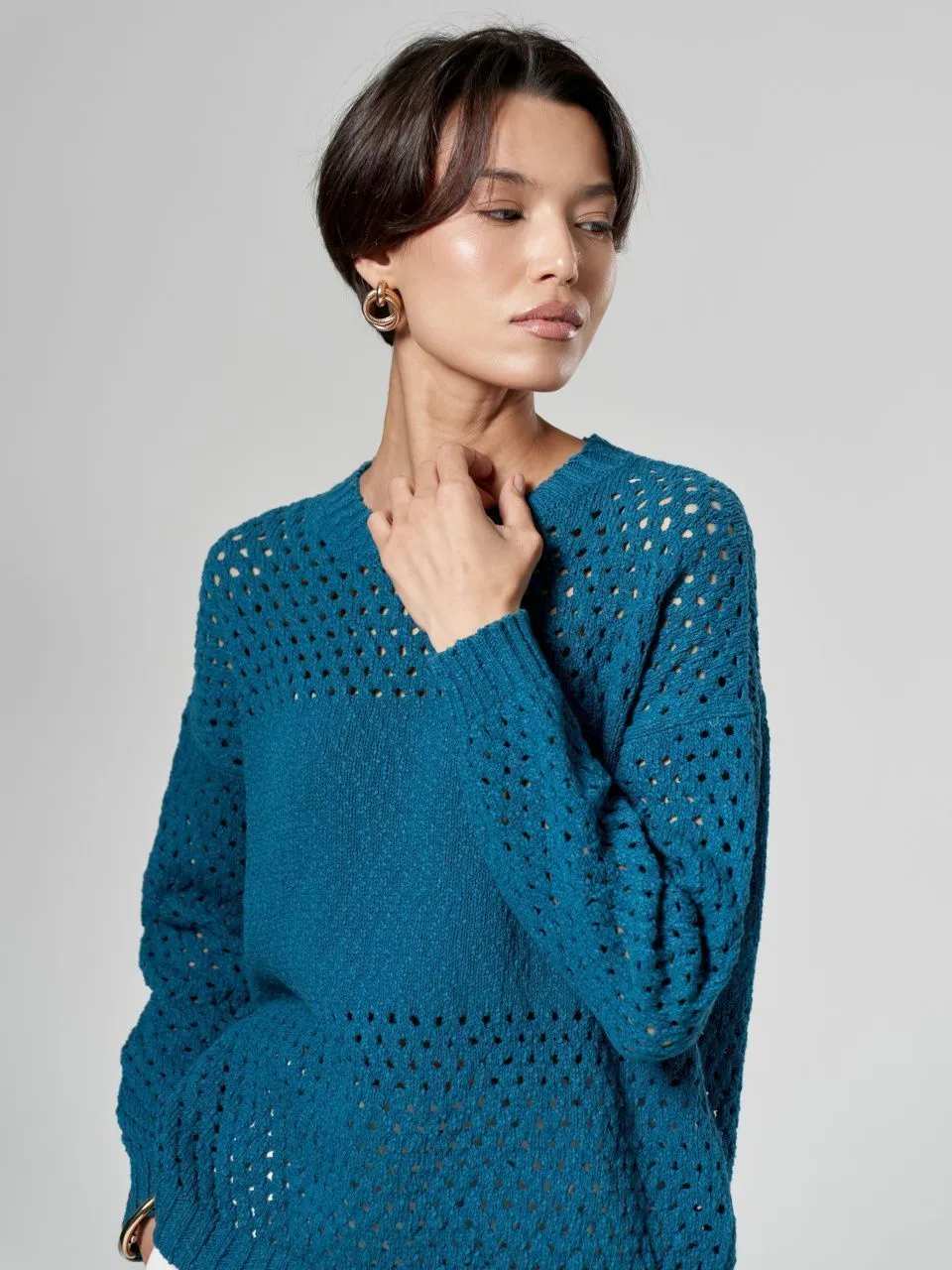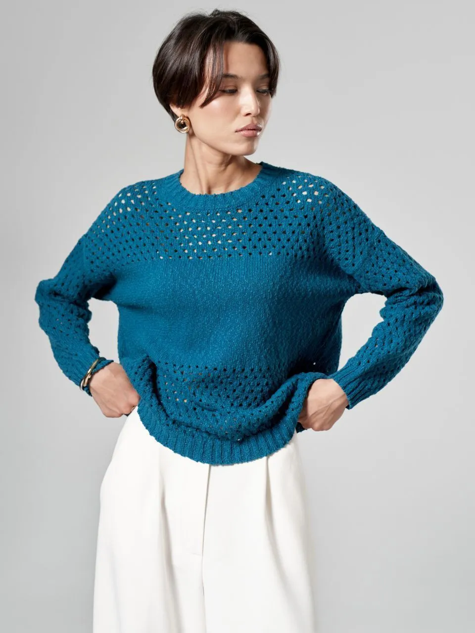 Этот джемпер – идеальный выбор для создания расслабленных и стильных образов в теплый сезон. Объемная ажурная вязка придает изделию легкость и воздушность, делая его прекрасным дополнением к брюкам или шортам. Свободный крой и приятная на ощупь фактура обеспечивают максимальный комфорт. Джемпер станет акцентным элементом вашего гардероба, добавляя ему нотку непринужденной элегантности.