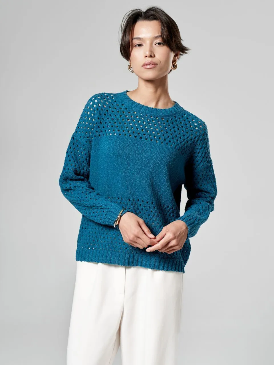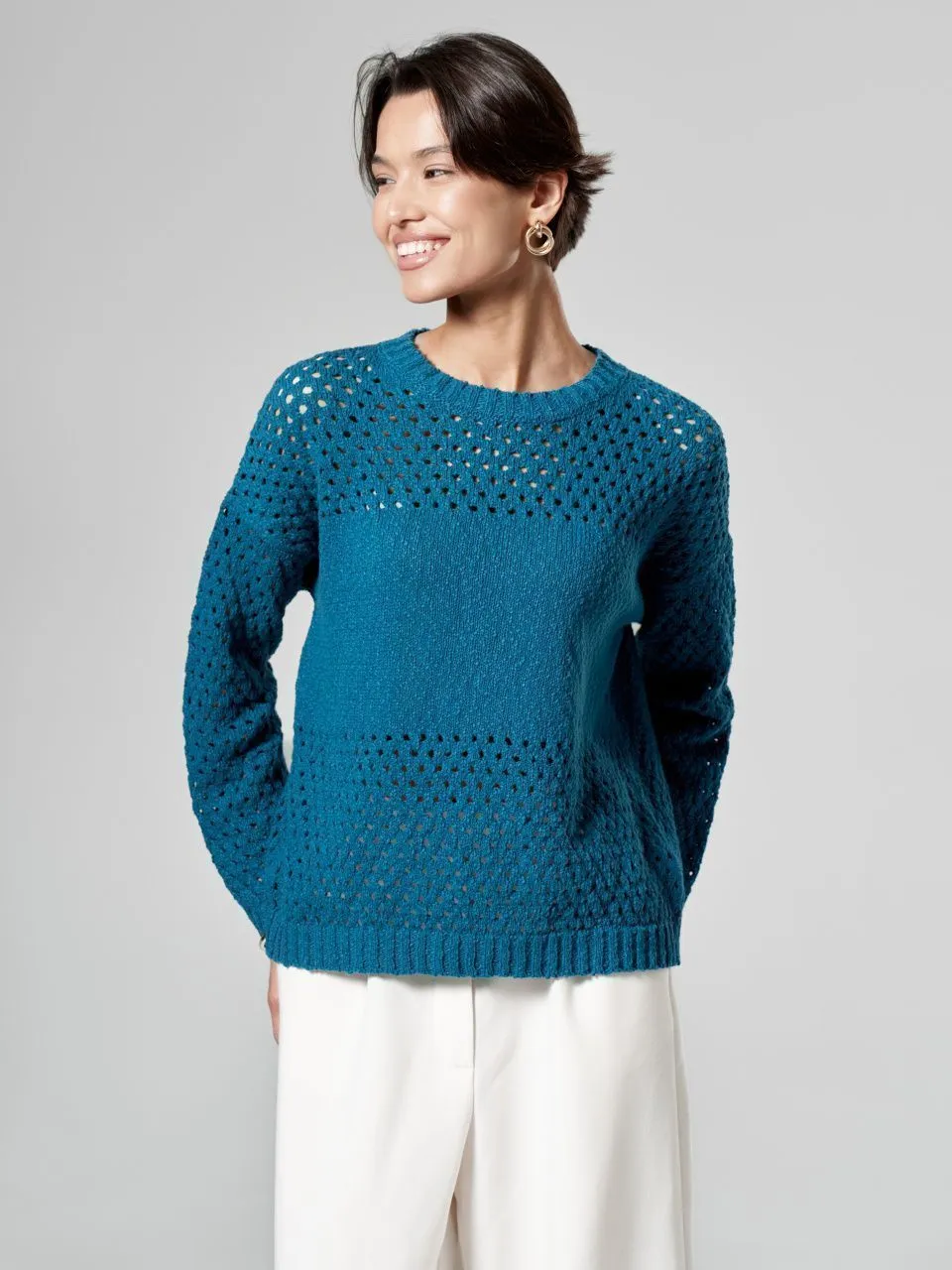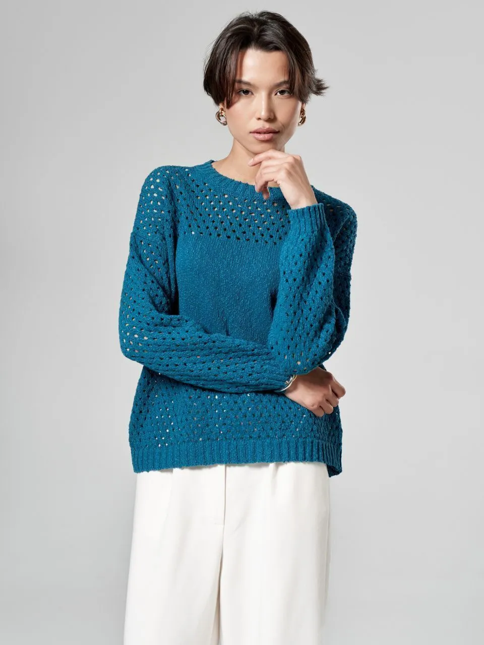 Джемпер с объемной ажурной вязкой из хлопка и льна