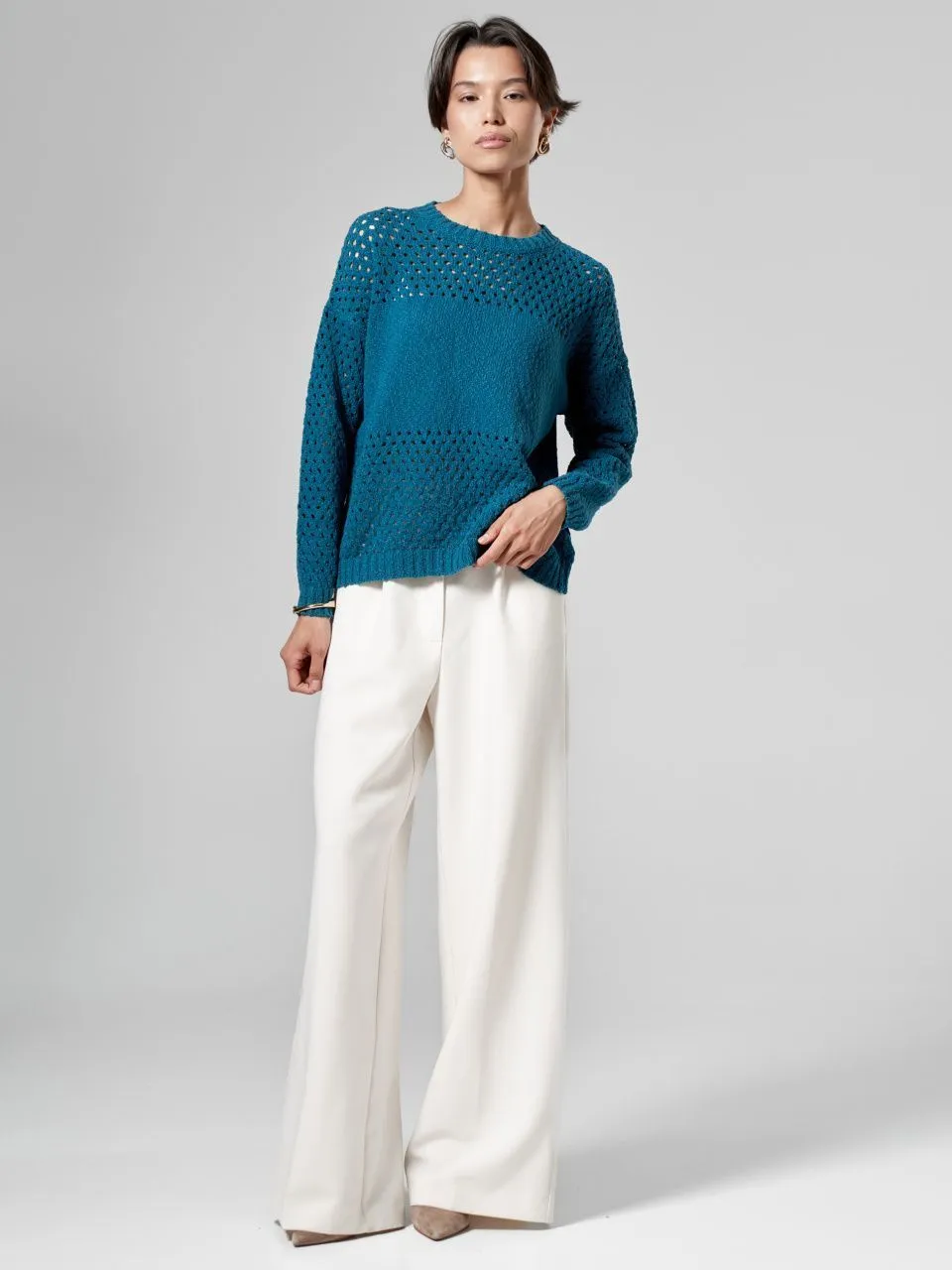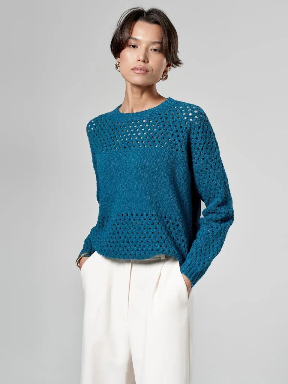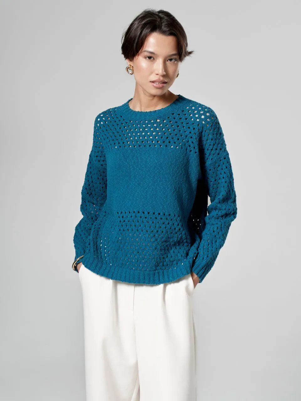 Джемпер с объемной ажурной вязкой из хлопка и льна