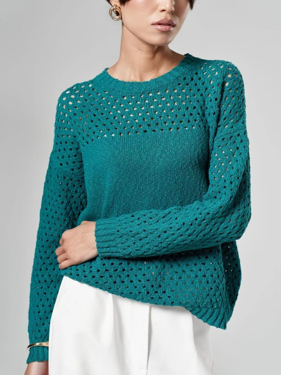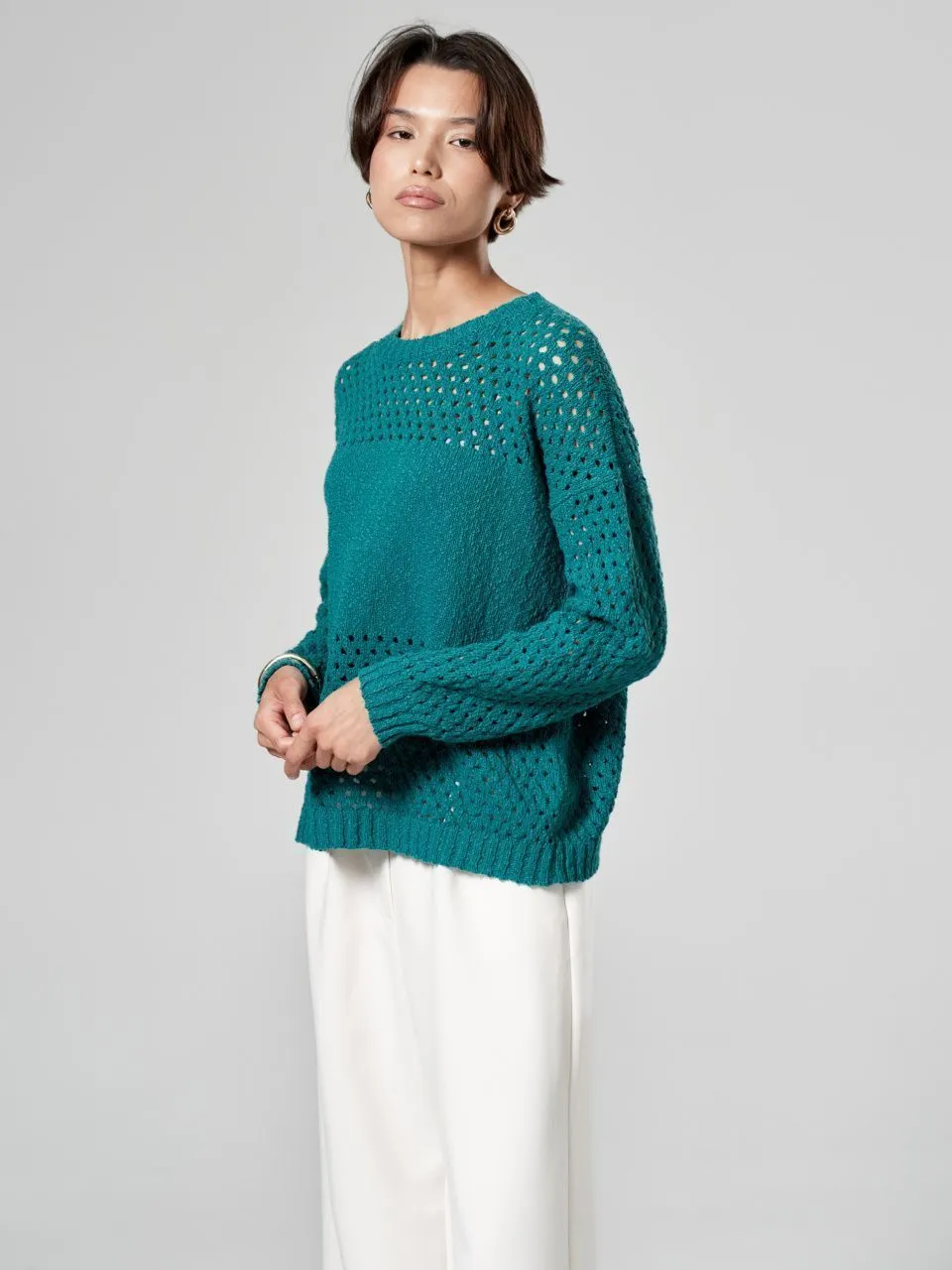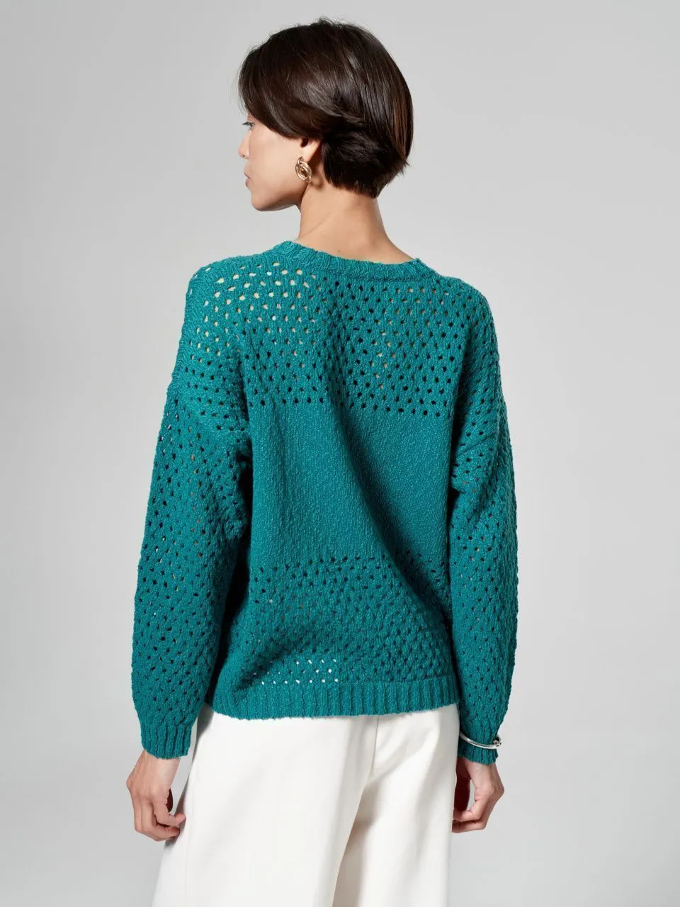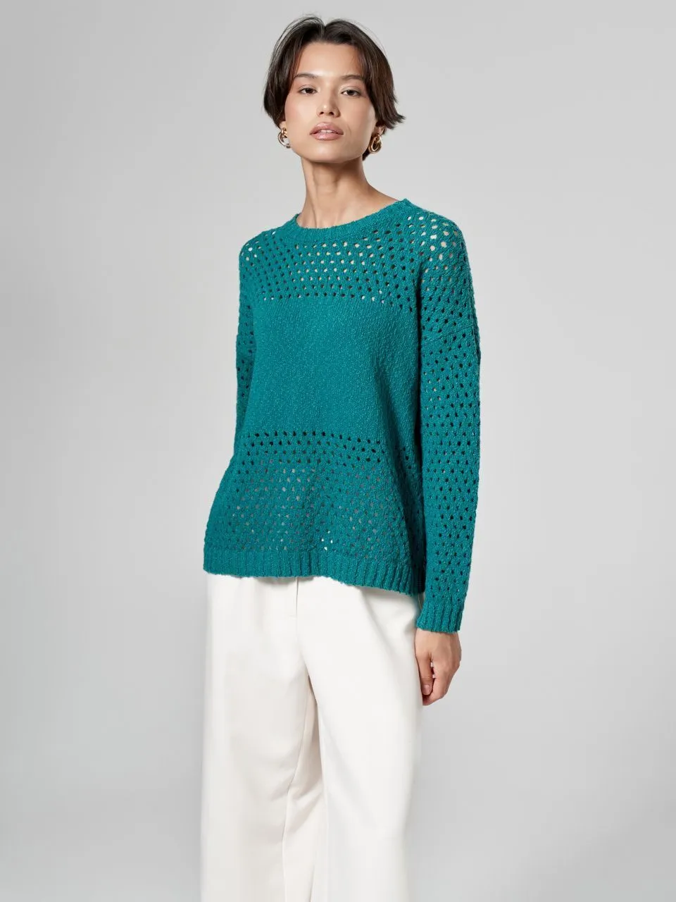 Джемпер с объемной ажурной вязкой из хлопка и льна