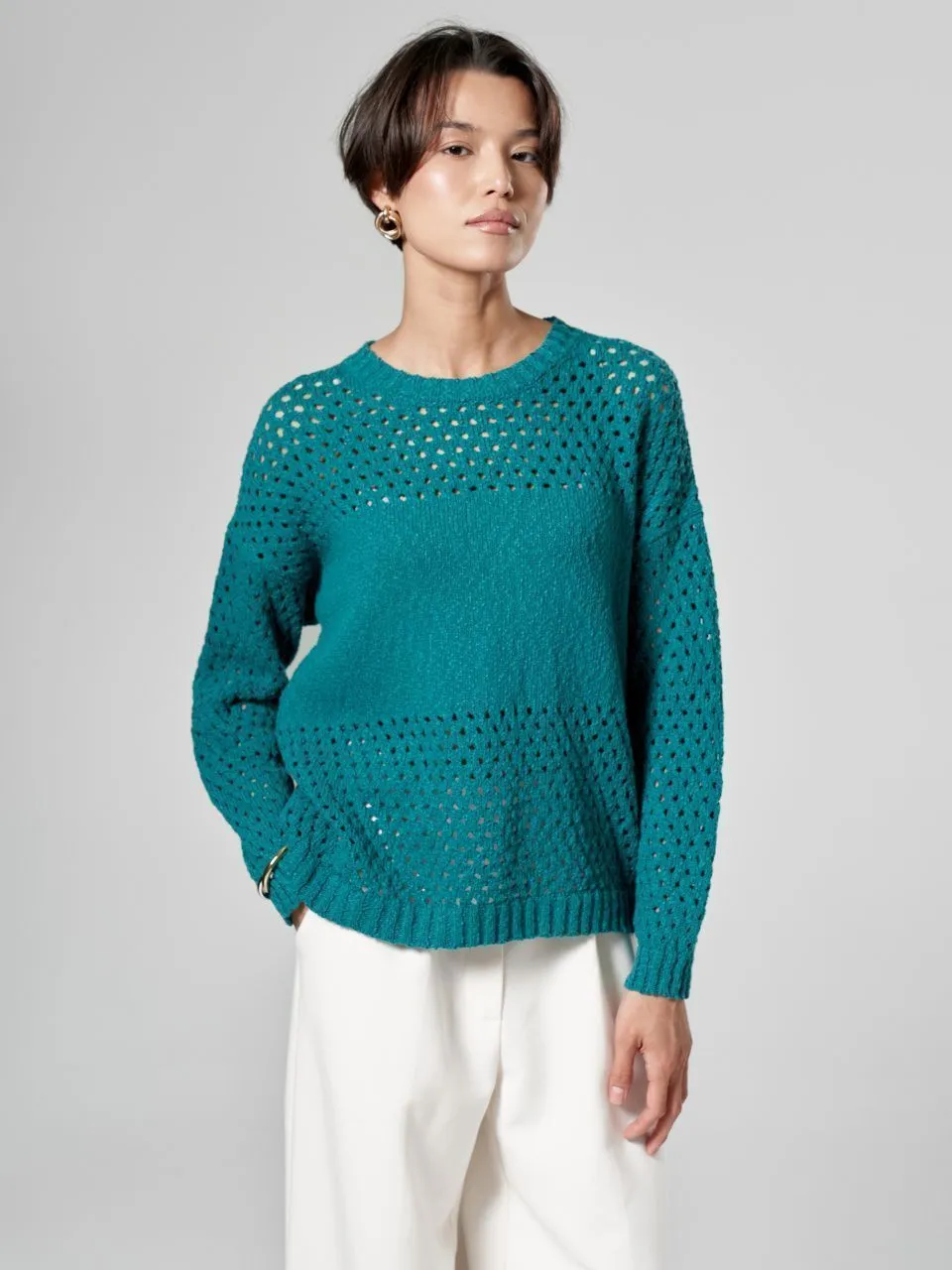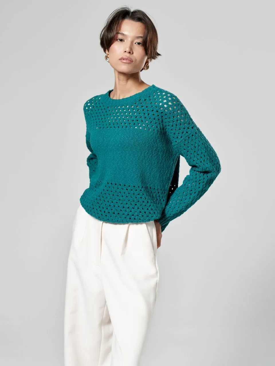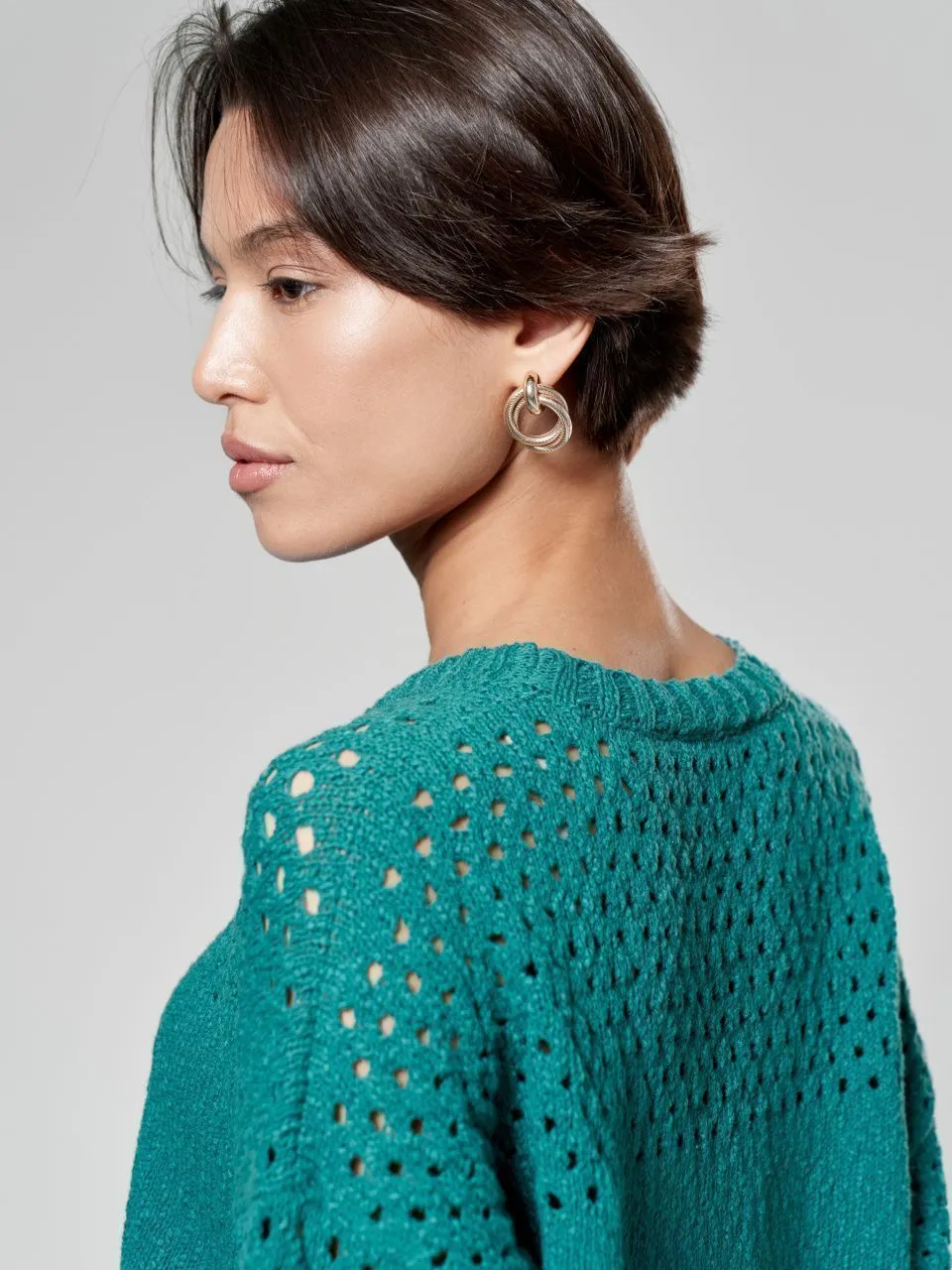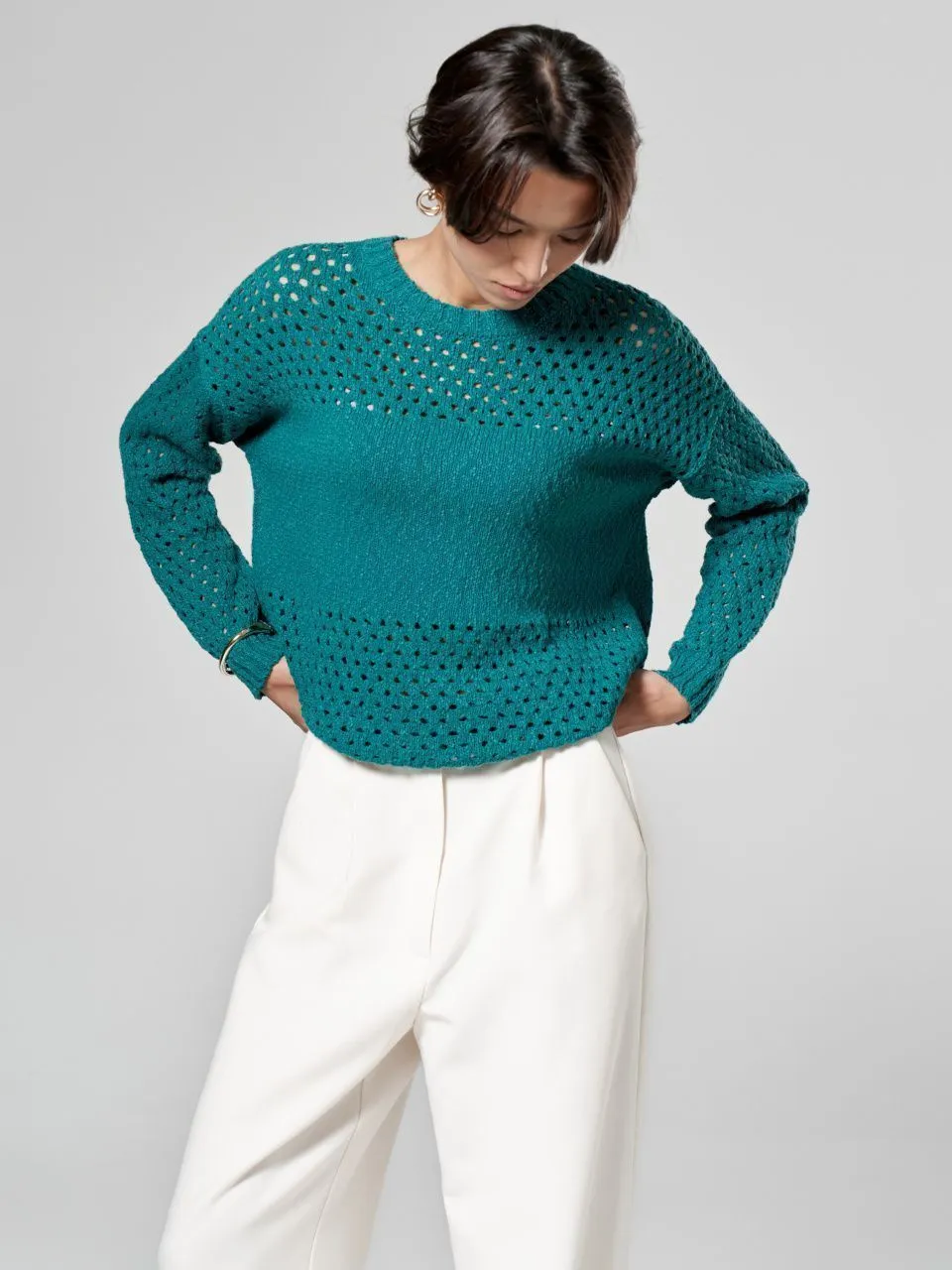 Джемпер с объемной ажурной вязкой из хлопка и льна