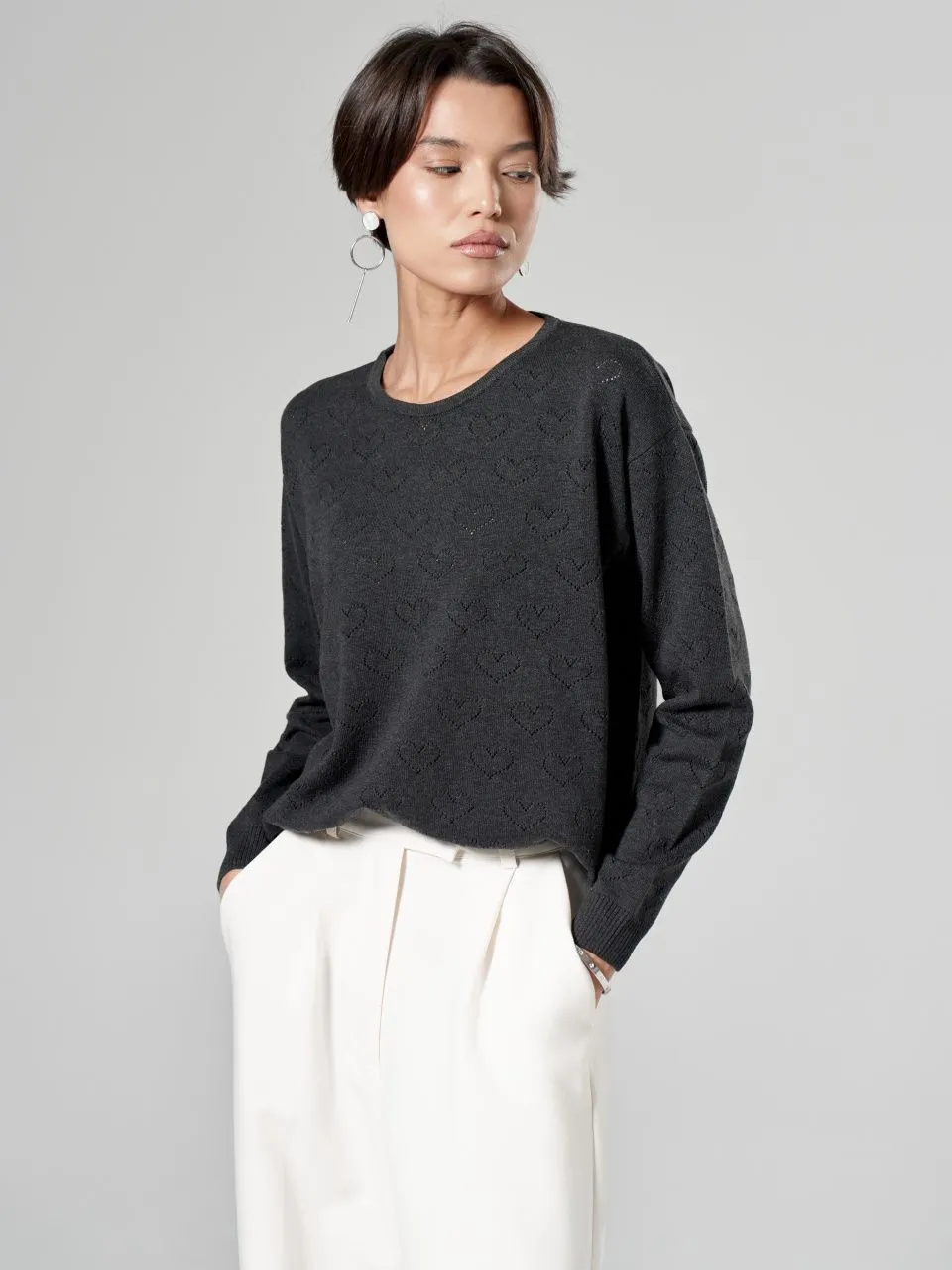 Этот джемпер - идеальное воплощение романтики и повседневного комфорта. Выполненный из натурального хлопка, он дарит коже ощущение прохлады и легкости, что делает его отличным выбором для весенне-летнего сезона. Изящный ажурный узор в виде сердец добавляет образу женственности и легкости, превращая базовую вещь в нарядный акцент.